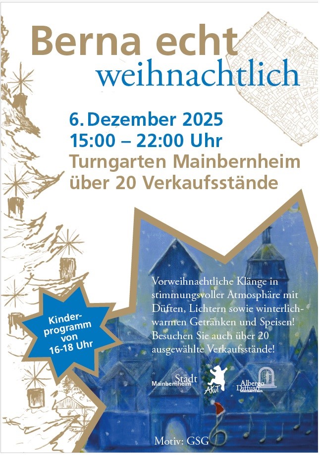 ich lade Sie herzlich ein zum Mainbernheimer Weihnachtsmarkt am Samstag, den 6. Dezember 2025 ab 15.00 Uhr im Turngarten an der nördlichen Stadtmauer.